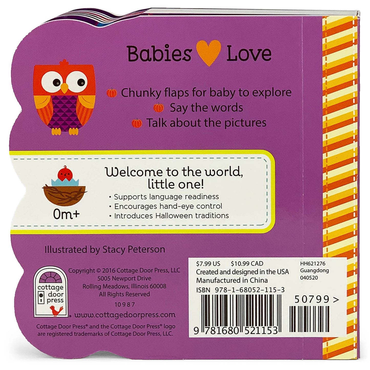 Everyone loves Halloween! Introduce your baby or toddler to classic Halloween traditions like costume parties and trick-or-treating, with this adorable lift-a-flap board book. This delightful rhyming story is paired with simple sentences to reinforce future language structure while grasping and lifting the sturdy flaps helps support the development of fine motor skills. This first Halloween book makes a perfect gift!