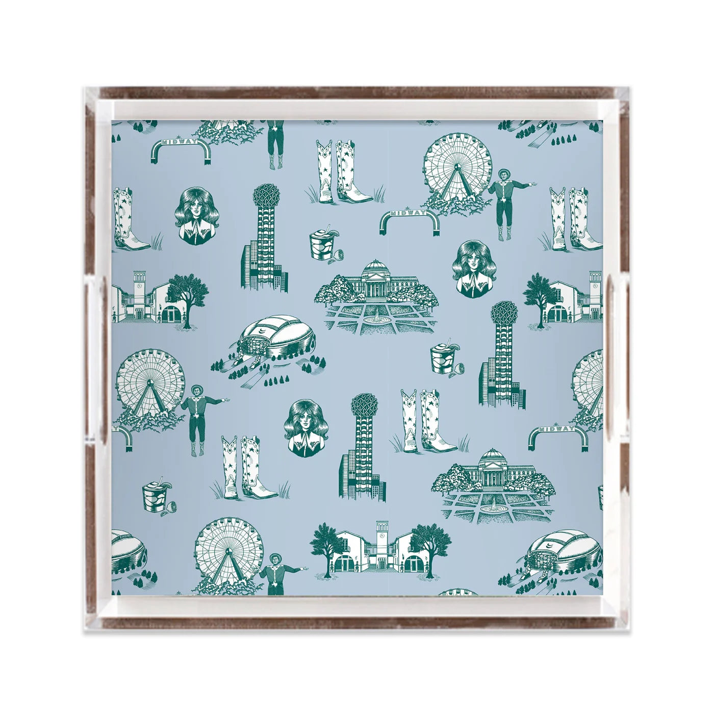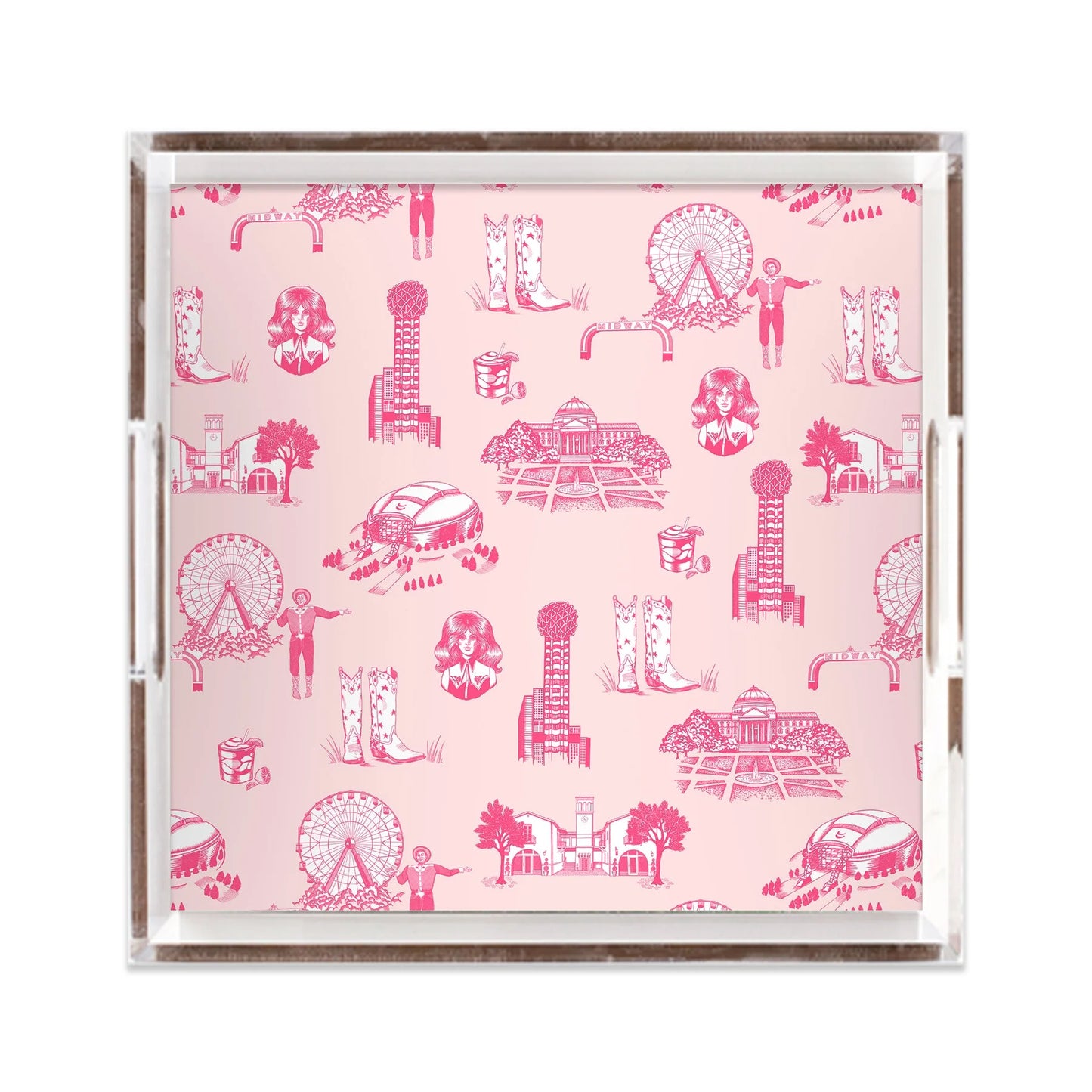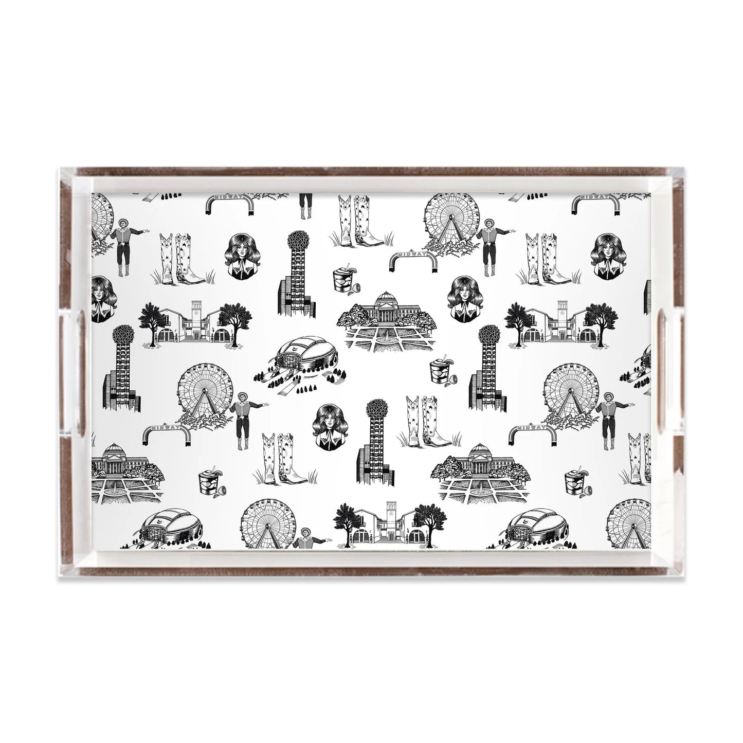 Inspired by the Big D, this hand-illustrated Dallas Toile print features Big Tex and the Texas State Fair, Jerry World, classic big Texas hair, Margretta’s Miron Crosby cowboy boots, and the iconic staple of the Dallas skyline, the Reunion Tower. Celebrate your Texan pride with this one of a kind Dallas Toile.