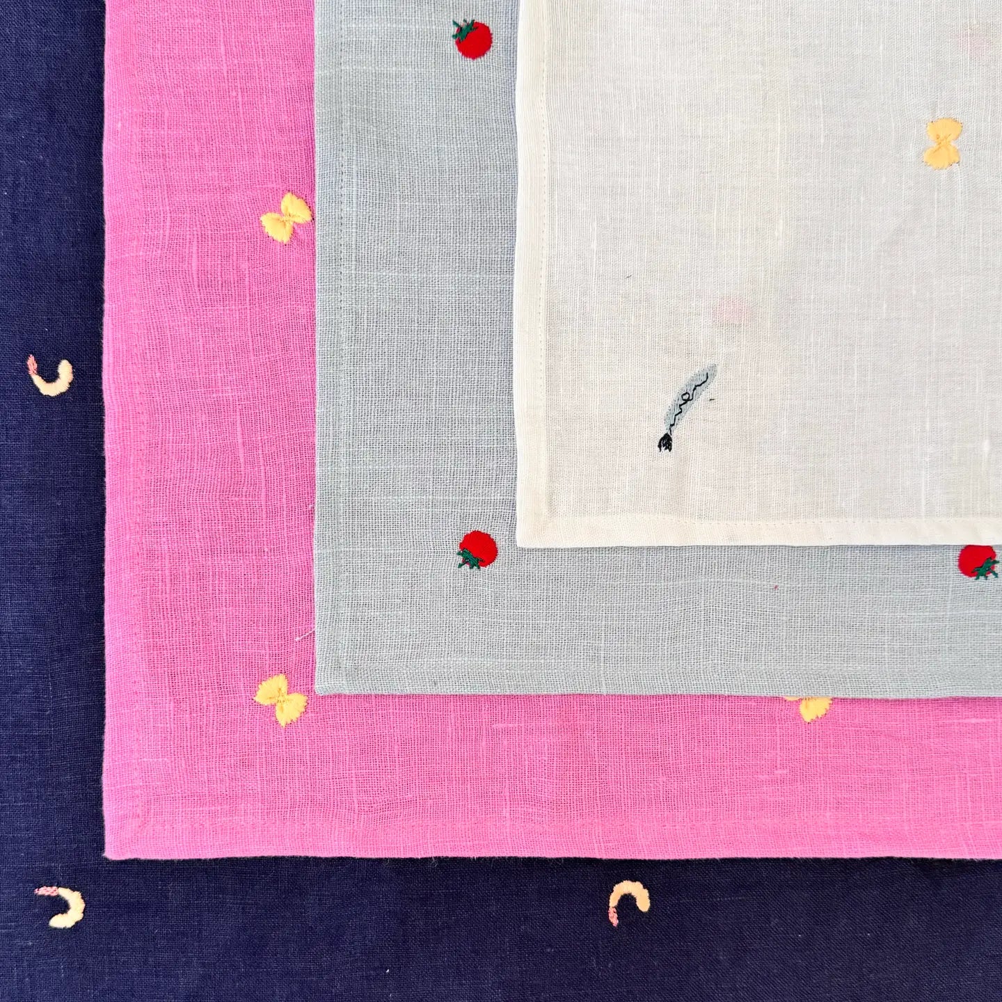 Meet our Ditsy Pasta Embroidered linen Napkins, available in pink and red, where charm seamlessly meets functionality. Made from washed linen, these super soft napkins (or tea towels!) with subtle yet conversational embroidery will impress every guest.