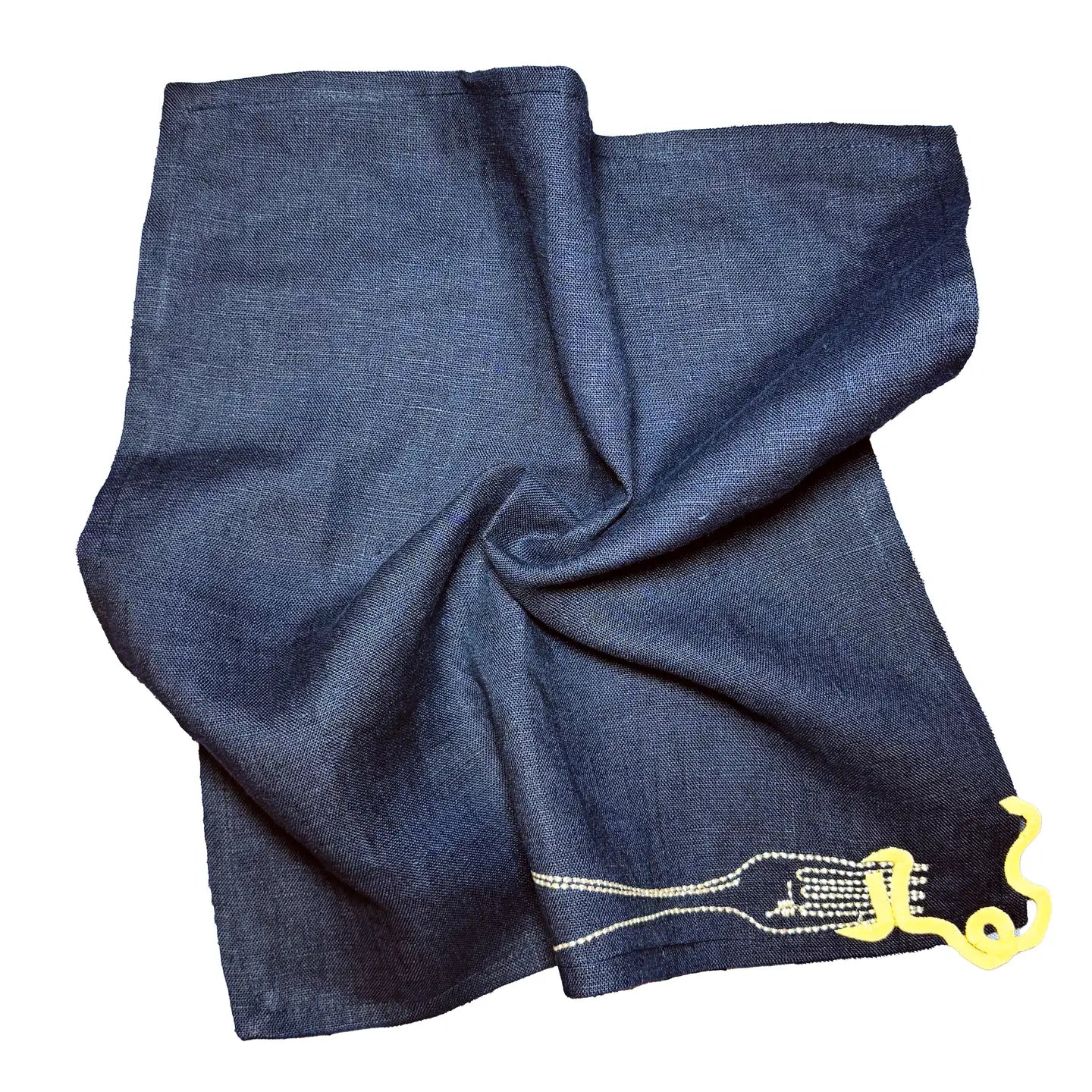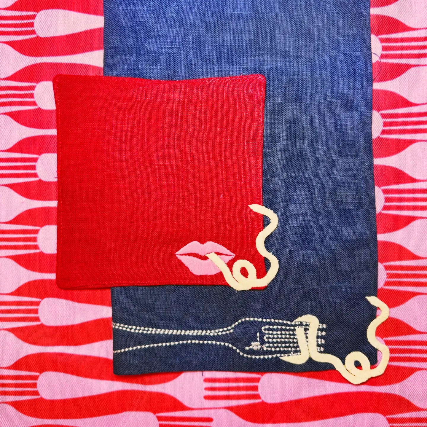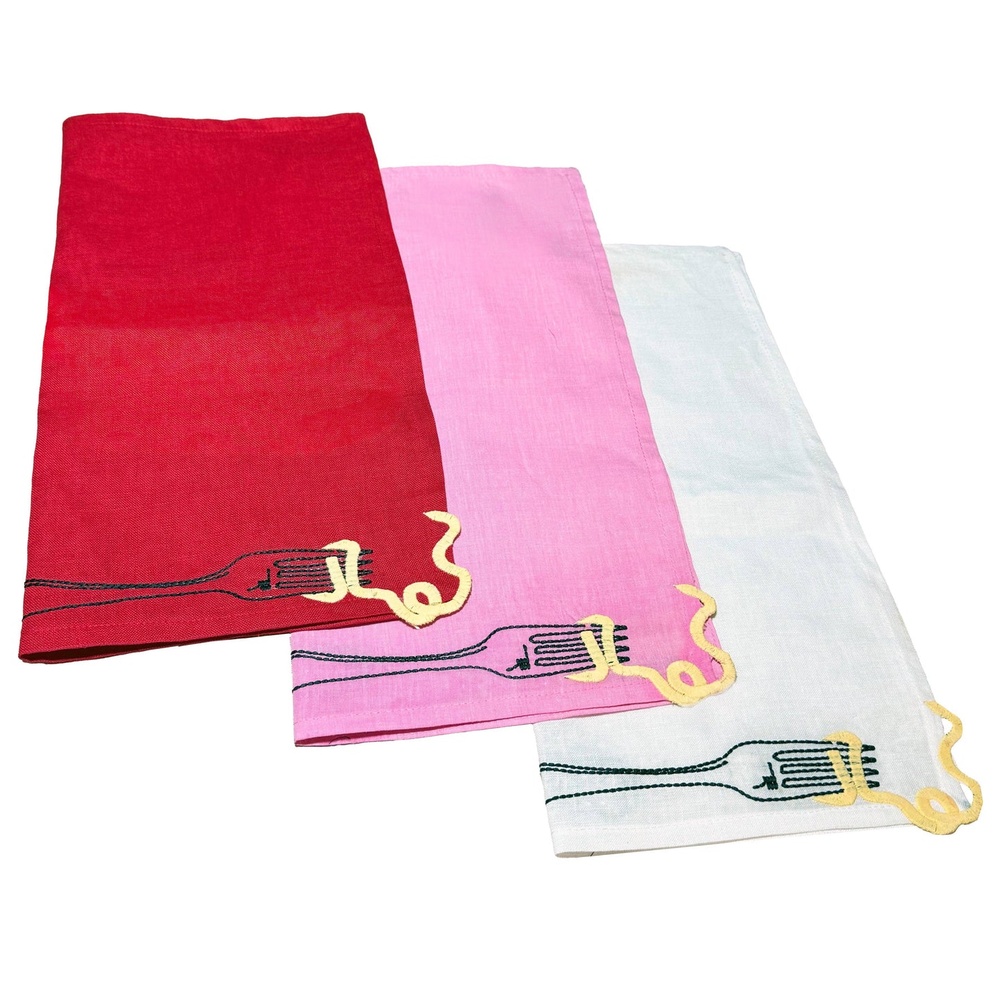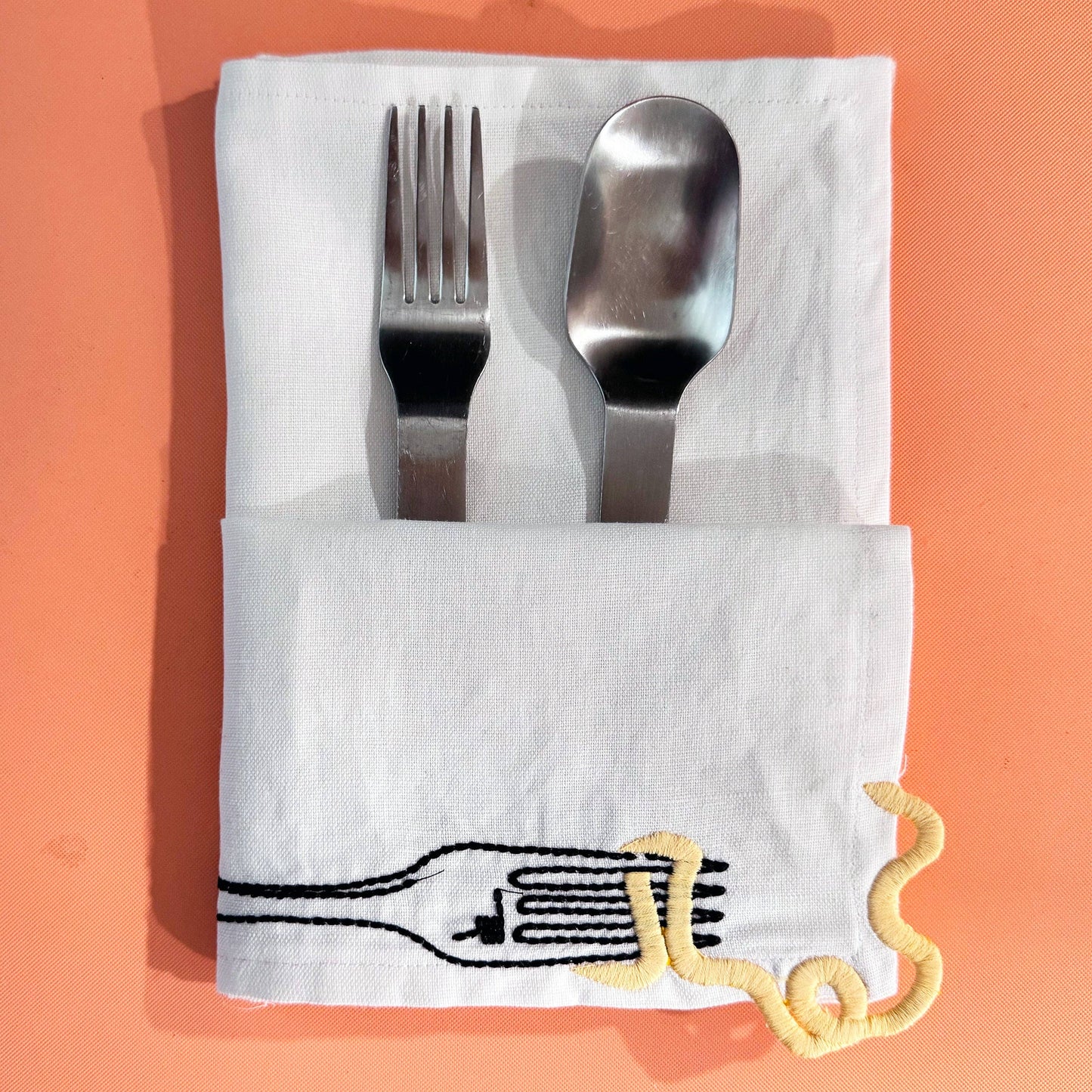 A whimsical set of two embroidered, white linen napkins, featuring vintage-style embroidery showcasing an amusing escaping noodle motif.