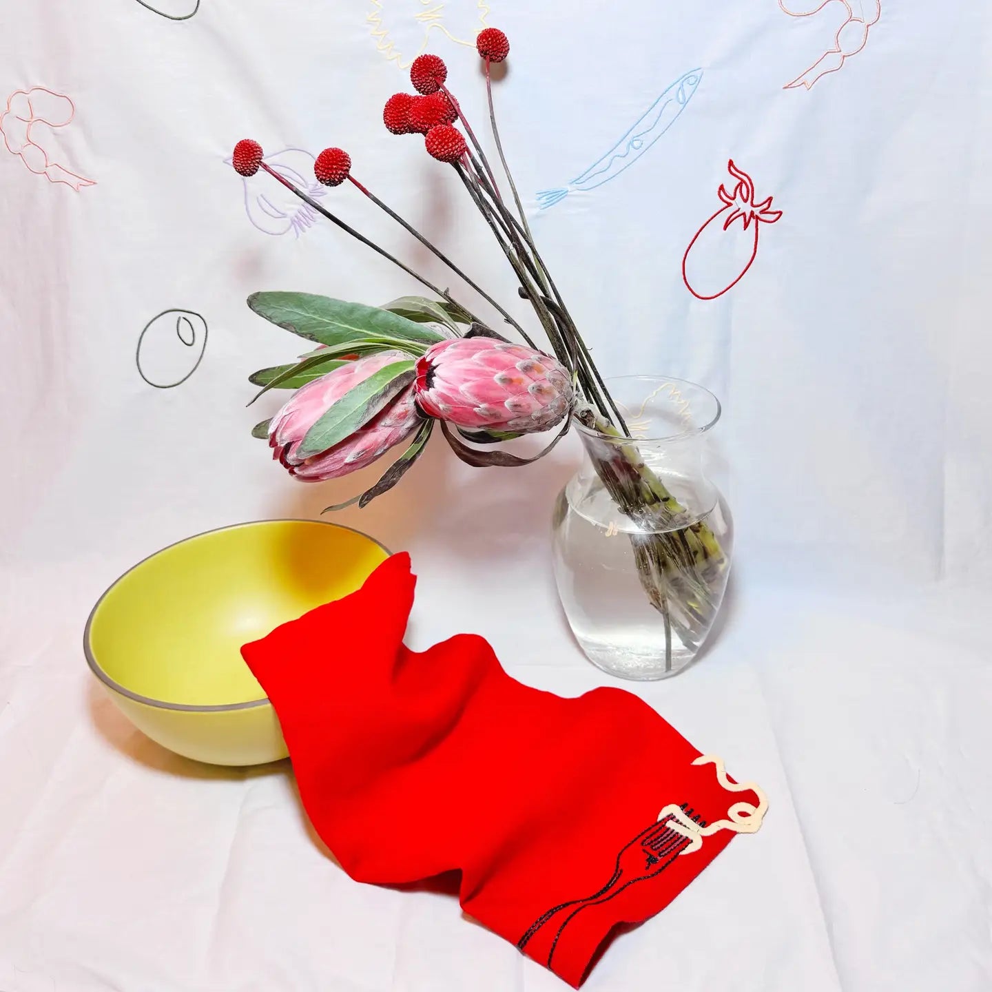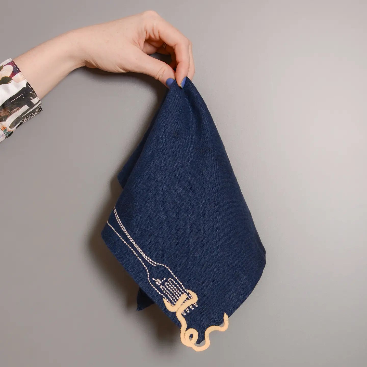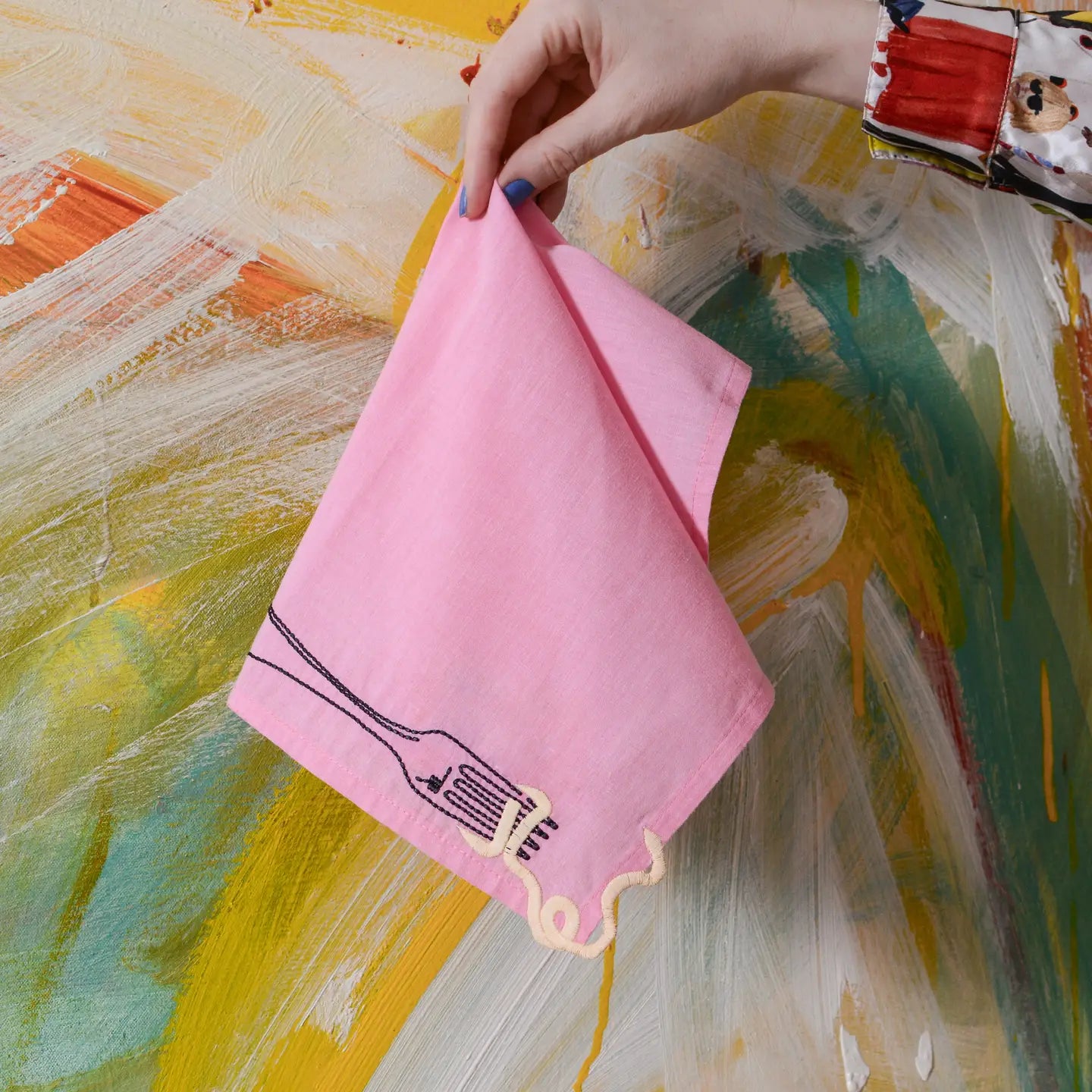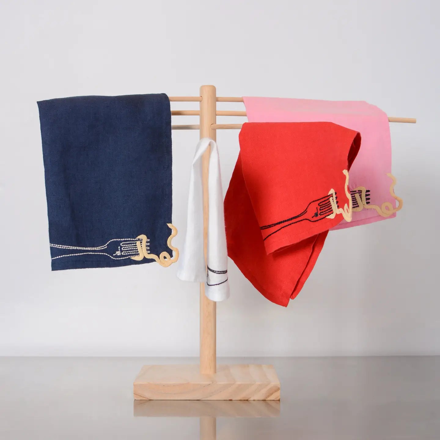A whimsical set of two embroidered, white linen napkins, featuring vintage-style embroidery showcasing an amusing escaping noodle motif.