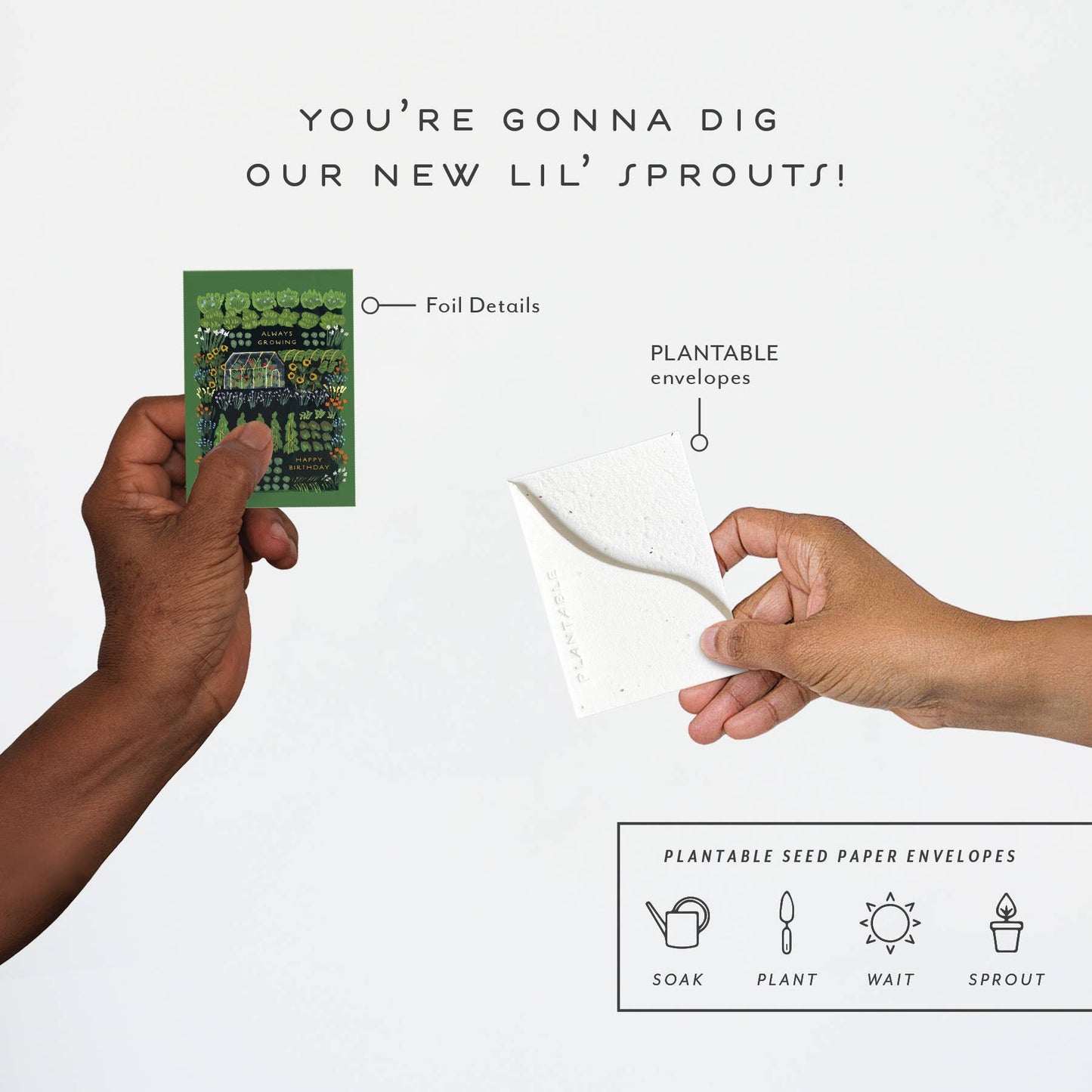 Meet the newest little SPROUT! Think all the goodness of our full size greeting card BUT at a petite "mini me" and super cute enclosure card size. All Seedlings sprouts have foil details and a PLANTABLE seed paper envelope which is embedded with wildflower seeds. This seed paper is made of a biodegradable eco-paper created with post-consumer materials - no trees harmed for this paper! When planted, our envelopes compost away leaving only flowers behind. Blank inside, our mini greeting cards are printed on premium paper and are all accented with foil details.
