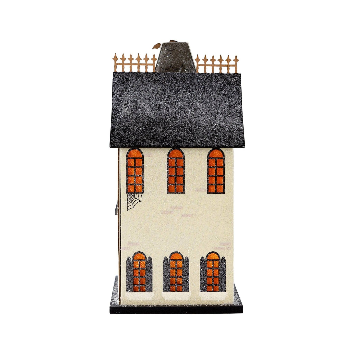 Add some supernatural flair to your home our Halloween Academy decor! Add some spooky flair to your home with this decorative piece. Perfect for creating a fun Halloween-themed village, this eerie addition is sure to be the talk of the town. * House is 4" wide x 4" deep x 8" tall * Constructed of heavyweight paperboard with glitter accents * includes battery powered light inside (please keep out of reach of small children)