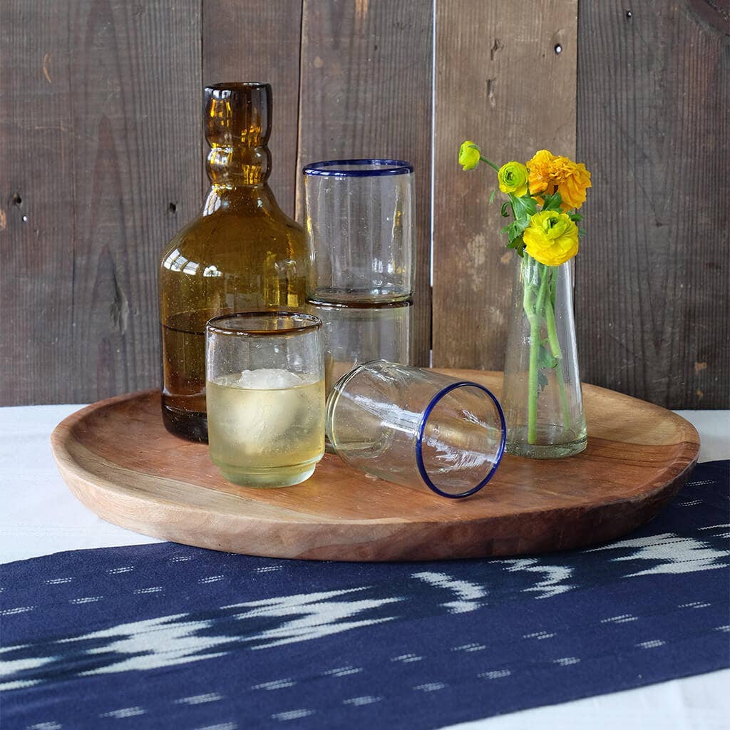 These stacking glasses similar to Mexican glass, are made by artisans in Guatemala. They are handmade with recycled glass that is crushed and melted down, and then hand blown by the artisans to create these beautiful, large stacking glasses.