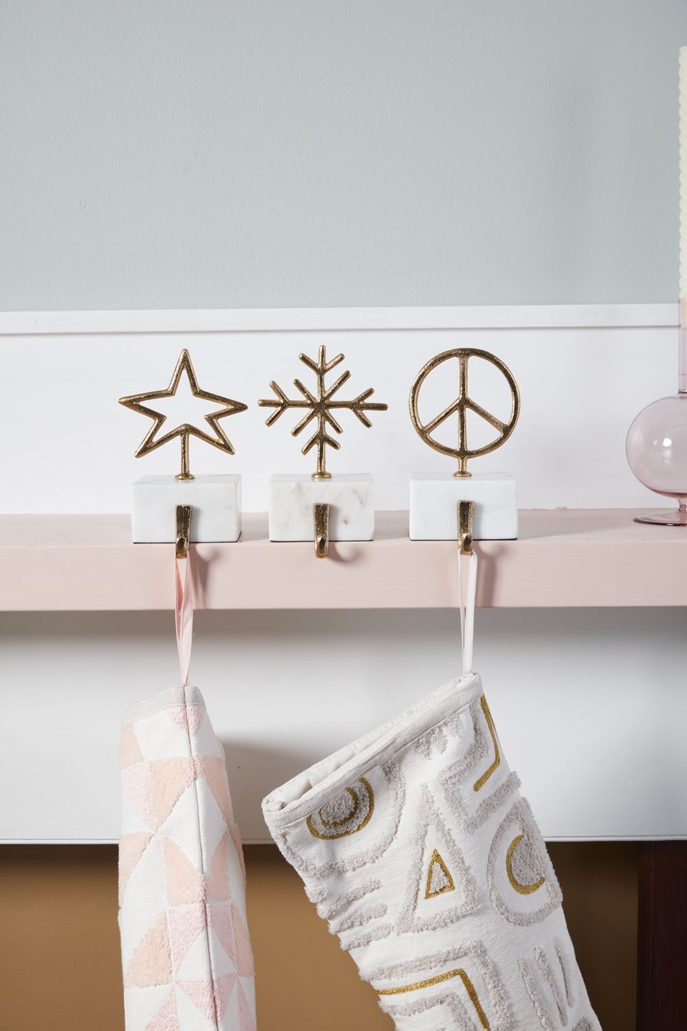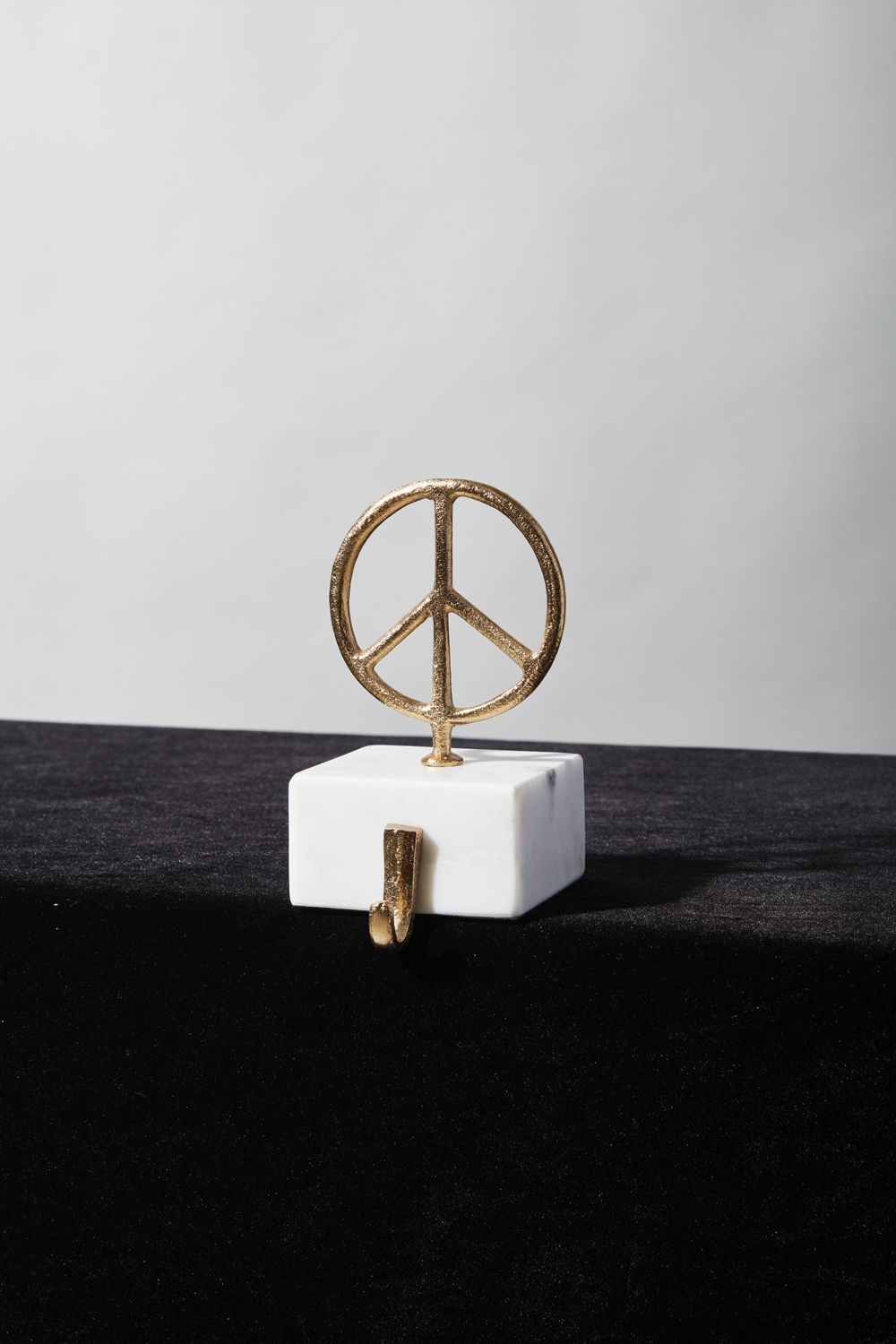 Enjoy the stunning beauty of bright gold cast aluminum & white marble with the sturdy Winter Skies Stocking Holder, featuring a gold peace sign suspended on a marble base with a stocking hook. The weighty base keeps goodies secure on the mantle.