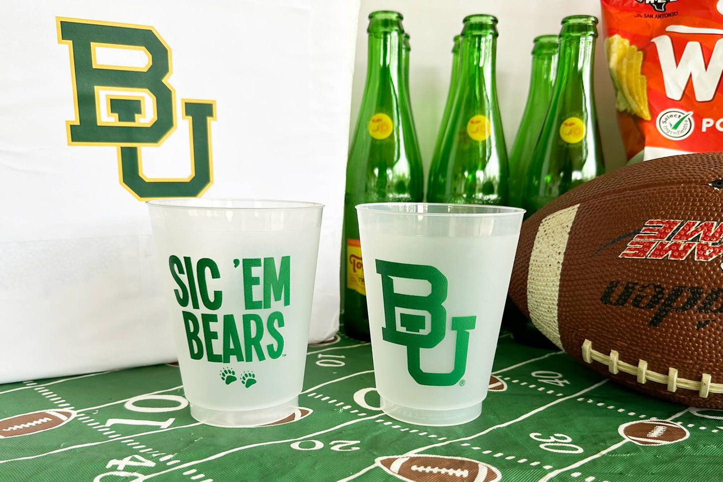 Our Baylor University frosted roadie cups show the licensed logo from Baylor University and Sic 'Em Bears on the opposite side of each cup. Printed in Baylor green ink these make a great football tailgate cup or graduation party cup.