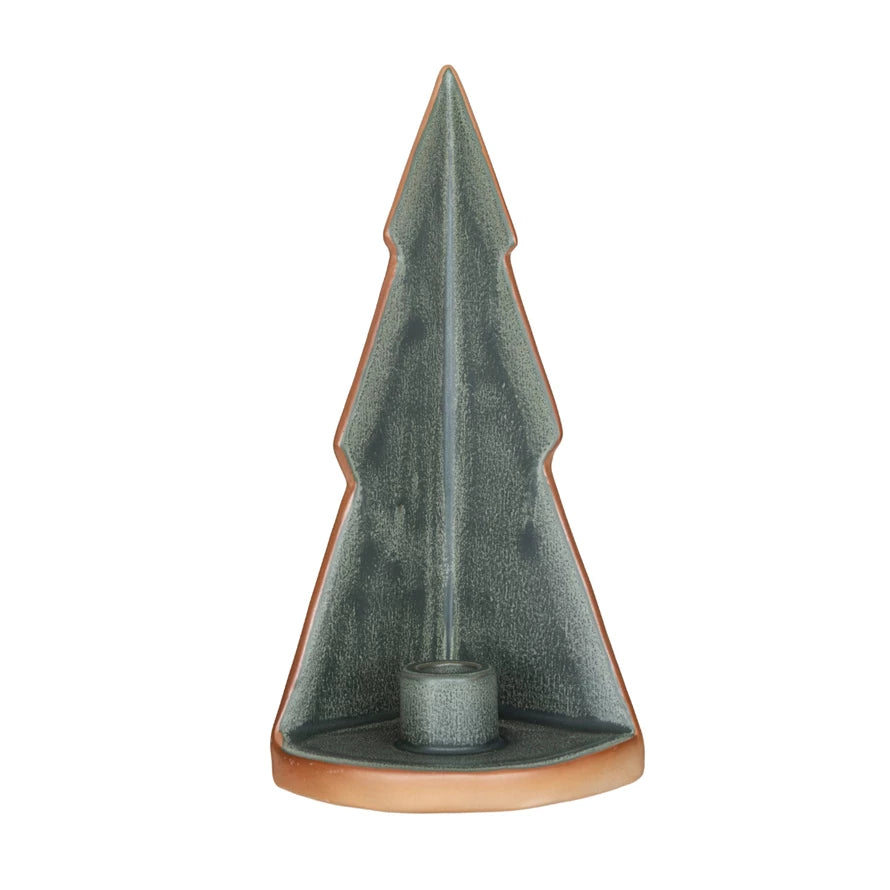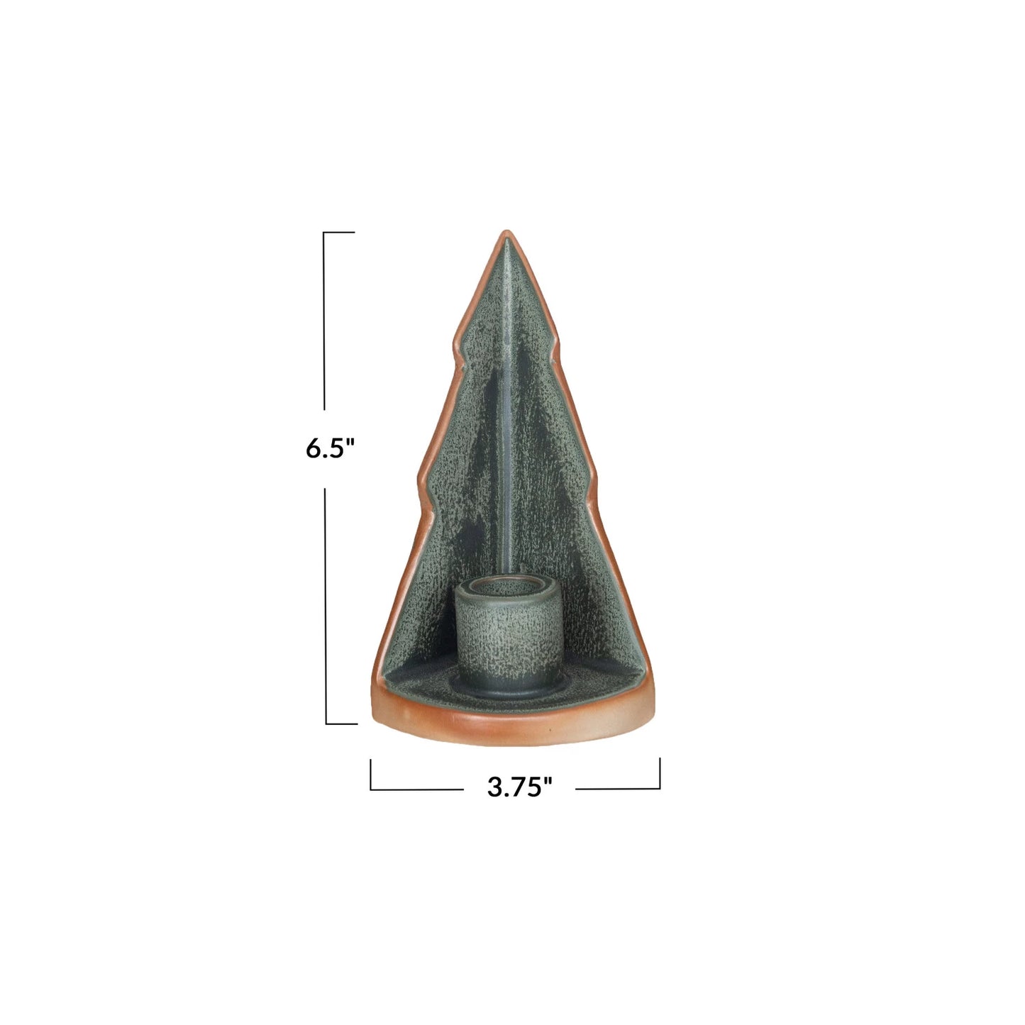 This stoneware tree taper candleholder is a fusion of natural beauty and artistic design. The reactive glaze in shades of green, alongside the unglazed portions, gives each candleholder a one-of-a-kind look, ensuring that every piece is unique. Whether lit or unlit, it's a captivating addition to the decor. The intricate details of the tree branches and leaves add a touch of elegance to the overall design. Perfect for creating a cozy and inviting atmosphere in any home, this candleholder is sure to be a conversation starter among guests. A stately stoneware tree taper candleholder with a reactive glaze in verdant green, paired with unglazed sections for a rustic touch. An artistic addition that brings the tranquility of the forest into the home with its tree-like silhouette. Ideal for creating a peaceful ambiance, perfect for seasonal displays or as a year-round decorative element.