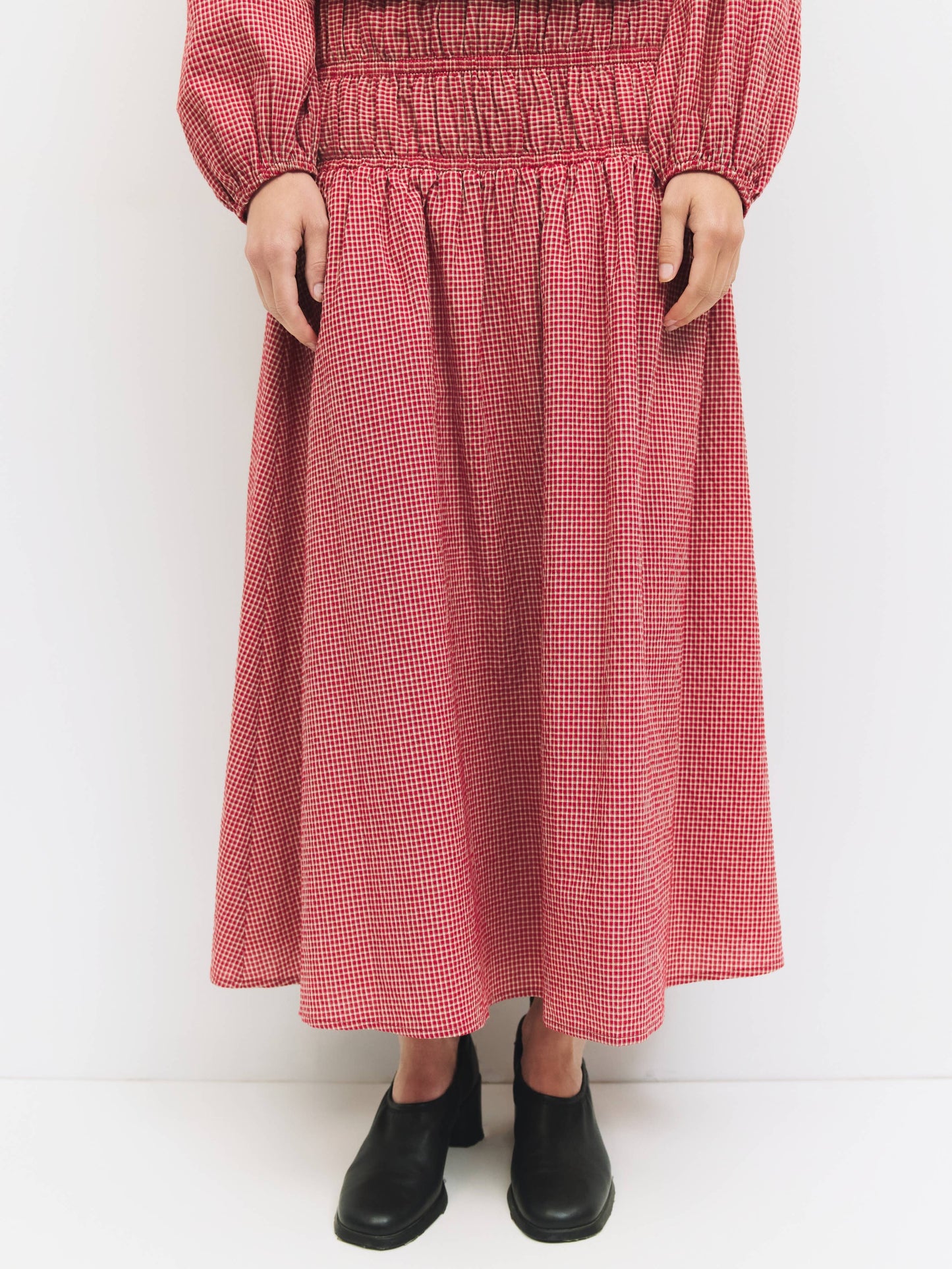 The Gisele Skirt is a tiered gingham midi featuring smocked rows around the hips and an elastic waistband for a comfortable fit. Made from lightweight fabric, it creates a full silhouette and pairs effortlessly with the Gisele Top.