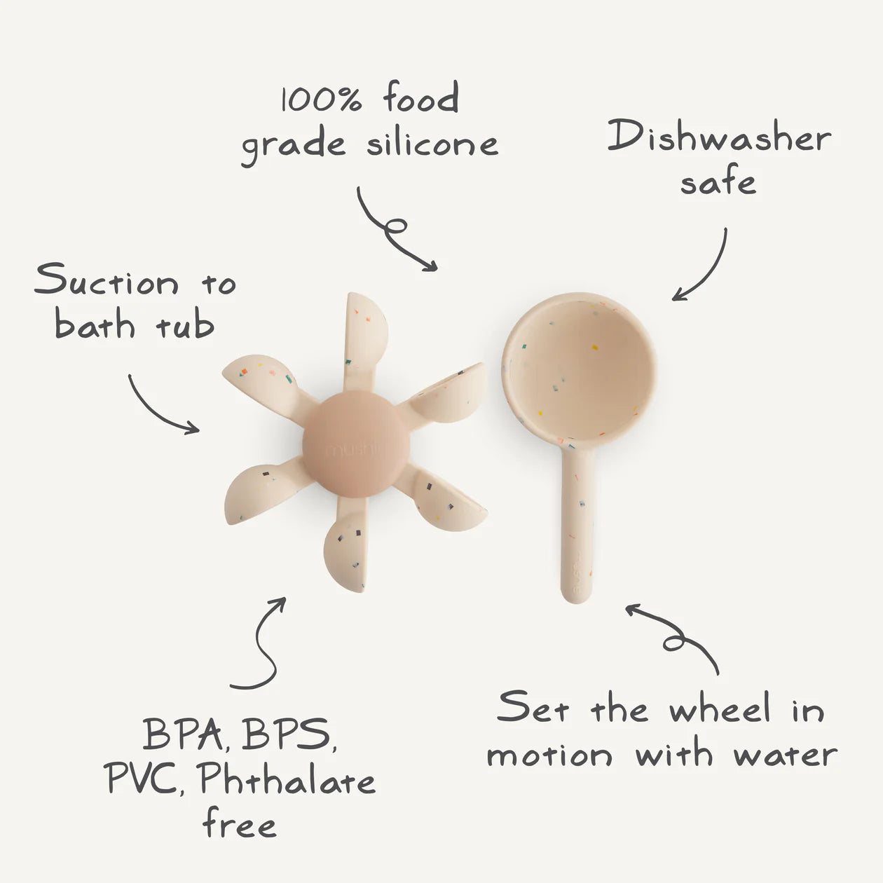 Add some excitement to bath time with the Mushie water wheel bath toy. This interactive toy suctions to the side of the tub and features a spinning wheel with little cups that come to life when water is poured in. Littles will love using the matching silicone spoon to scoop and pour water, setting the wheel into motion. Made from soft, durable silicone, it's easy to clean, and perfect for endless splashing fun.