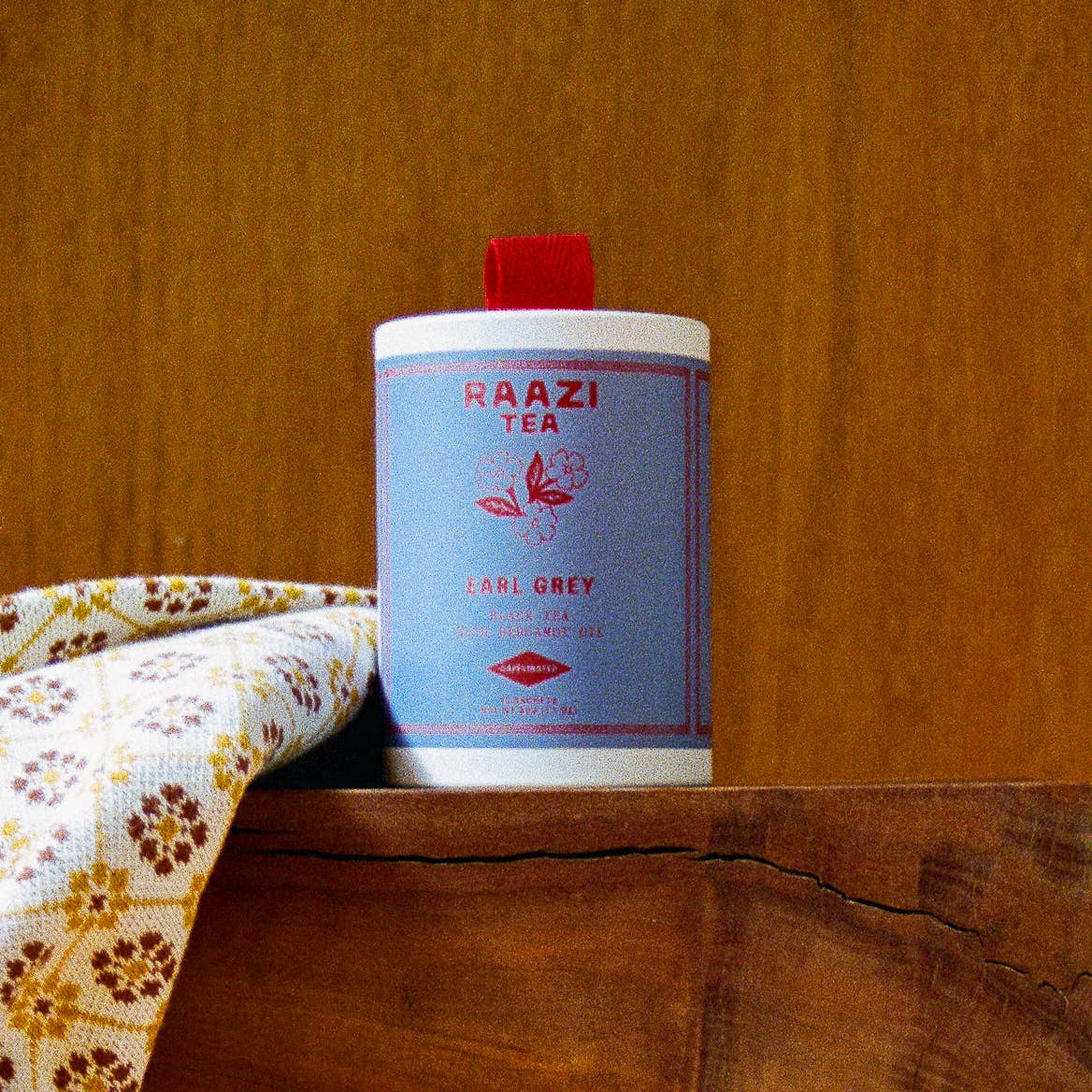 Our bold and citrusy Earl Grey tea. This is a caffeinated black tea, with Italian bergamot oil for a timeless flavor. Each box of Raazi Tea comes with 12 sachets made from a biodegradable, plant-based material, and are packaged into box made from recycled paper.