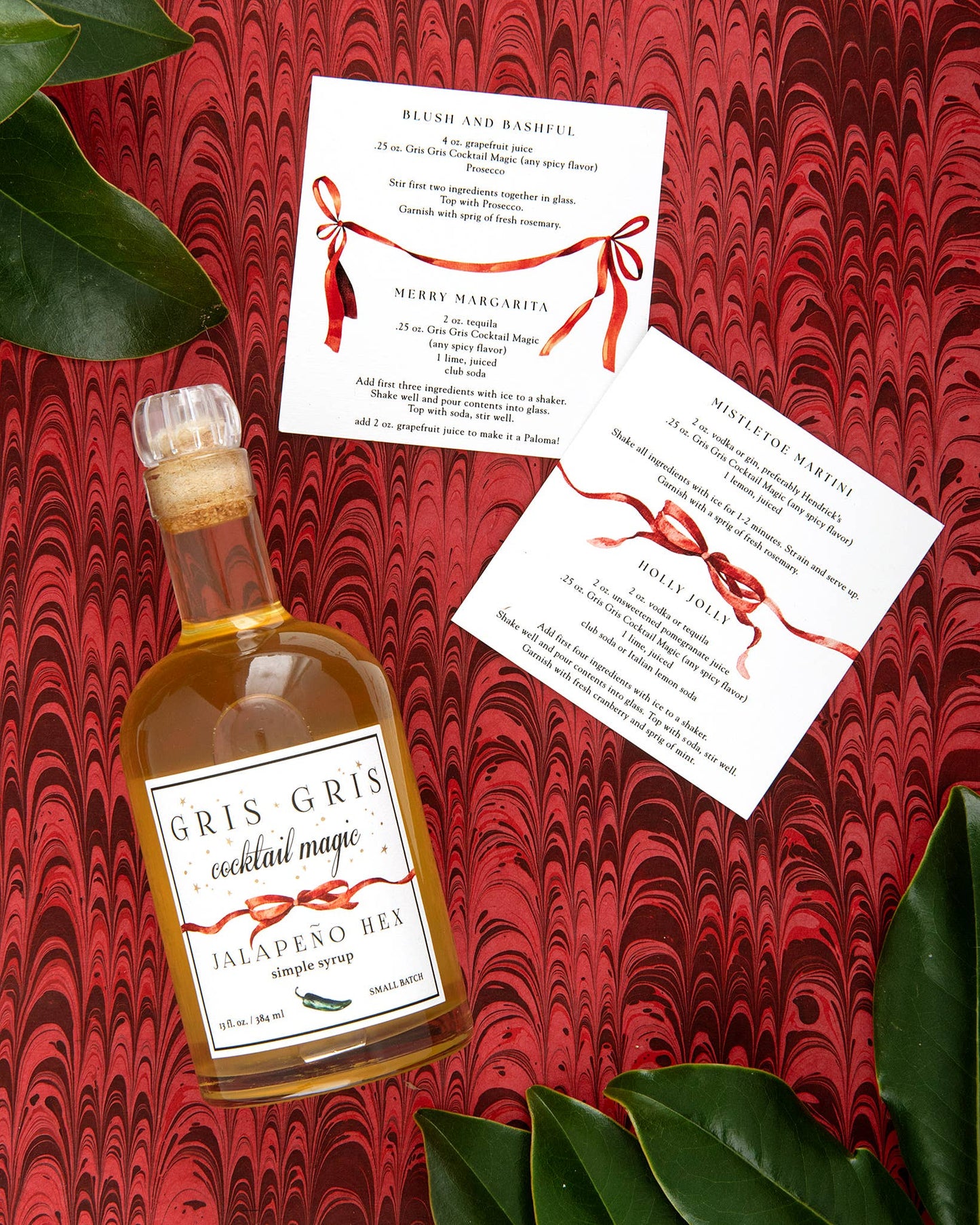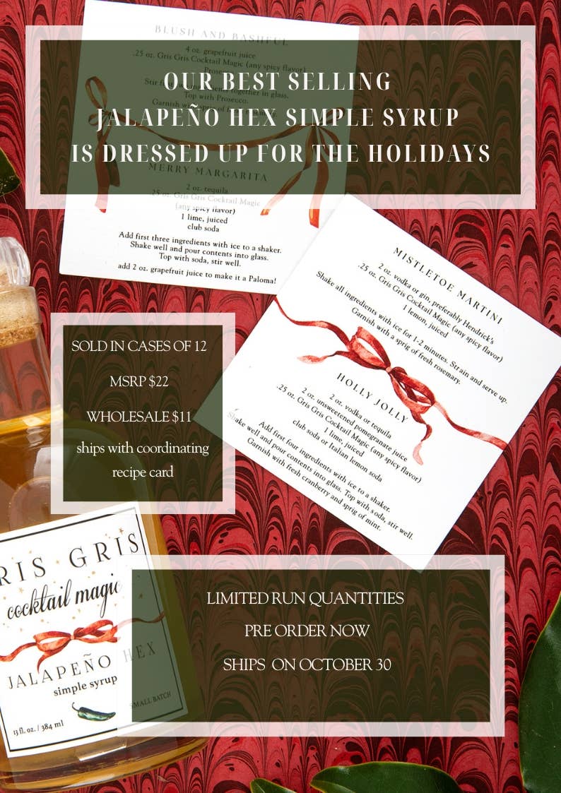 Our original flavor and top seller- Jalapeño Hex- has put on her party dress and is ready for gifting and the holiday party circuit! The recipe is the same but the look is festive-Each bottle comes with a corresponding recipe card making it the ultimate unique,chic and fun hostess/ gourmet holiday part that is a crowd pleaser!