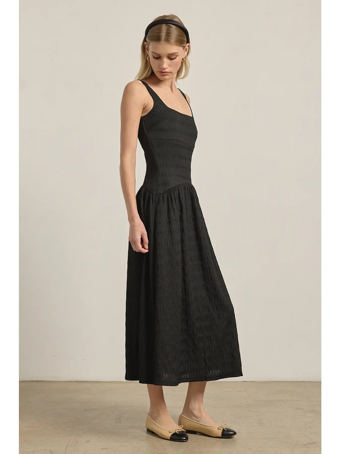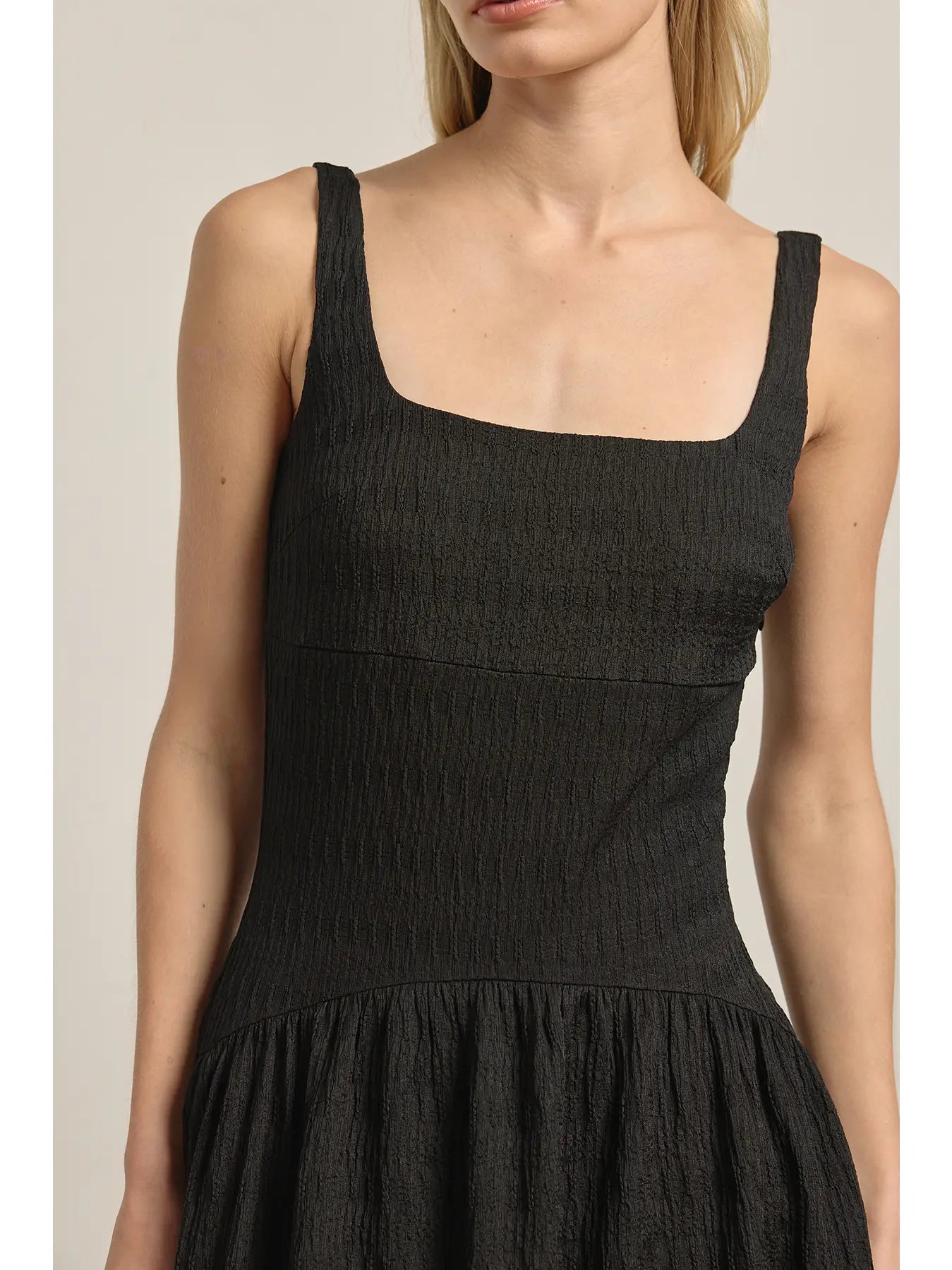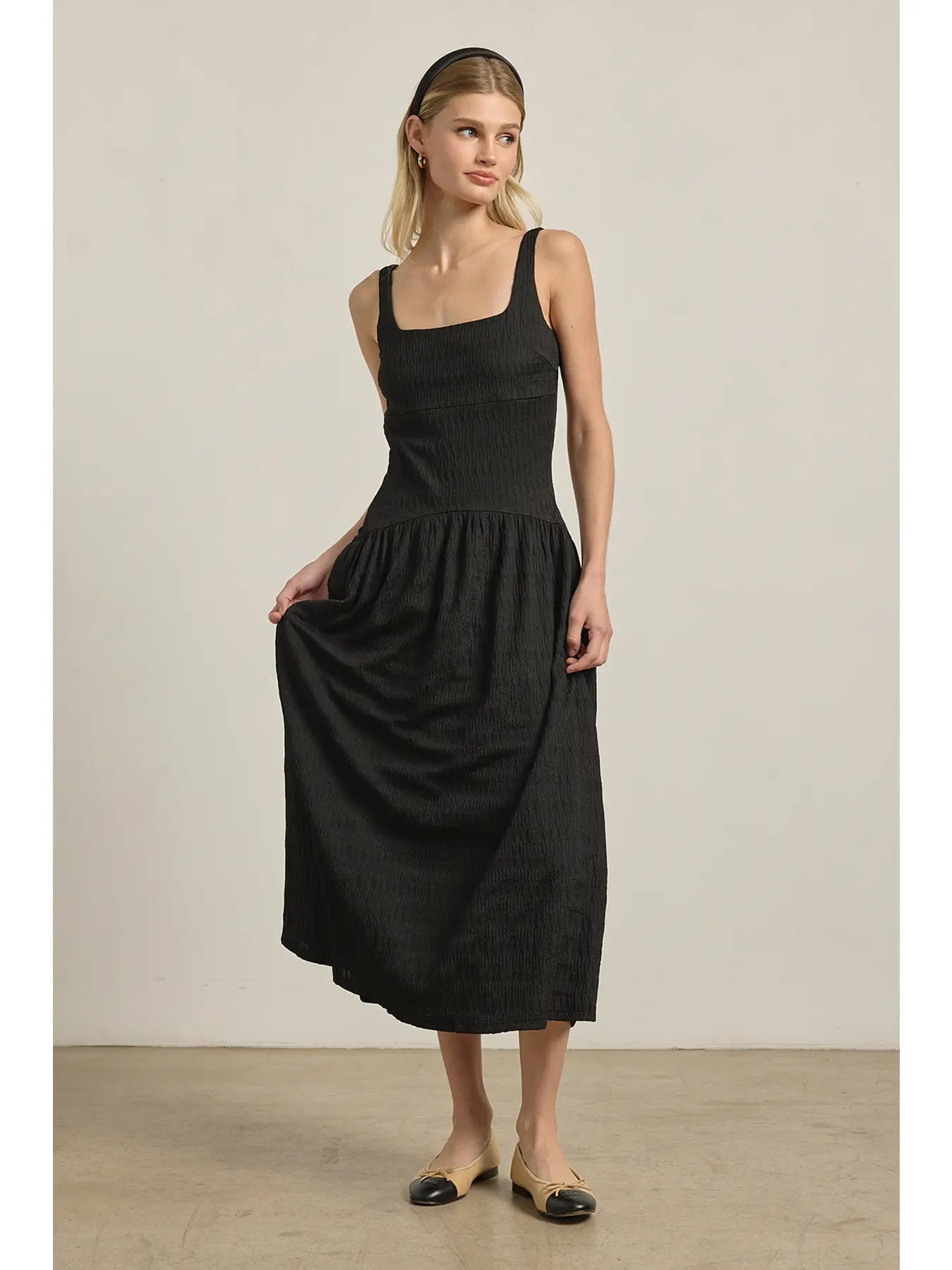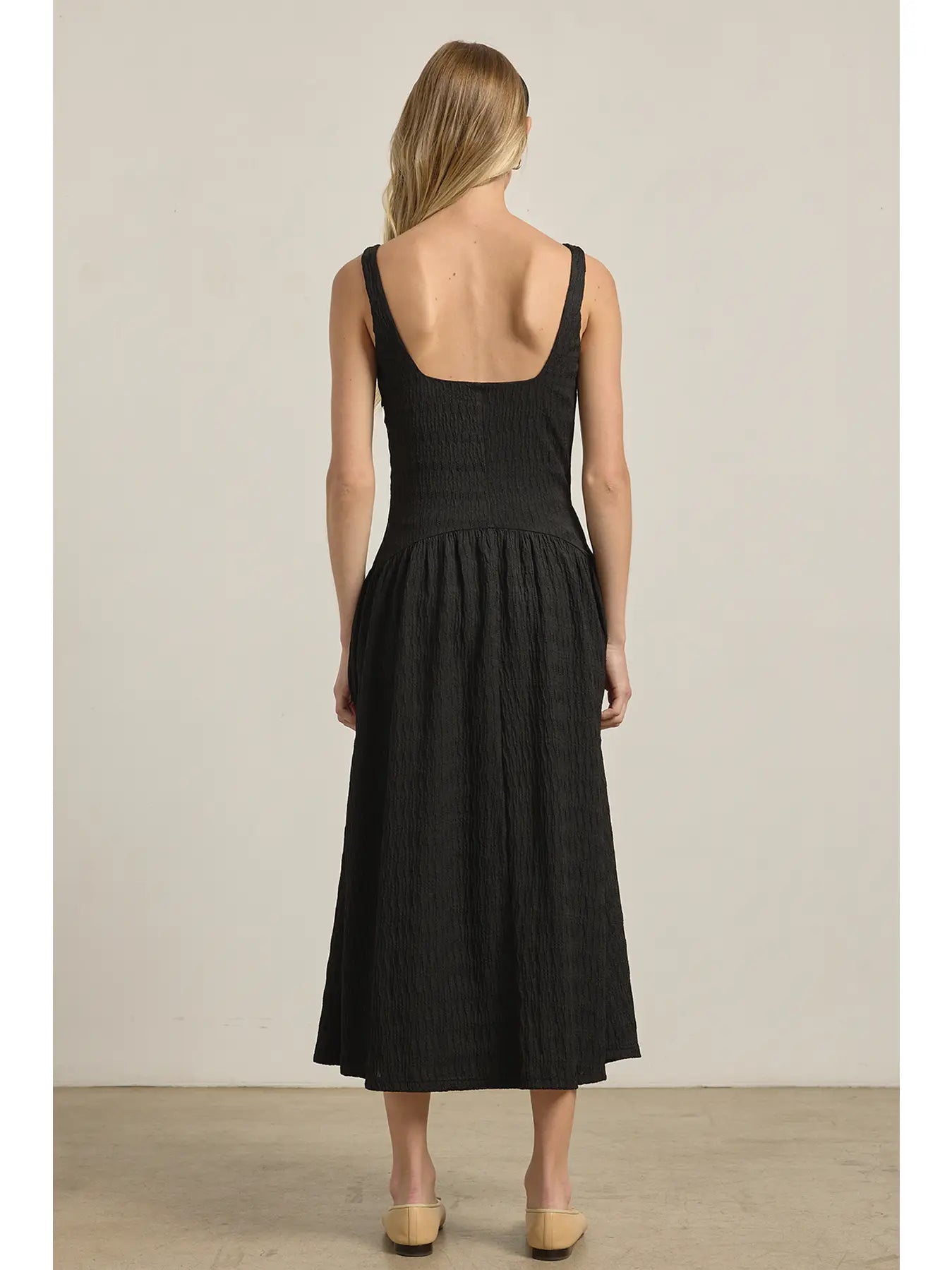 A chic midi dress cut from textured fabric with a flattering waistline that defines the silhouette. Fully lined for comfort, designed with wide straps and a square neckline for a modern look. Completed with functional side pockets for everyday ease. -Textured woven fabric -Smocked waistline detail -Fully lined -Side pockets -Midi length ** Model: 170 cm (5'7") wearing size Small Self: 95%polyster5%spandex Lining: 100%cotton