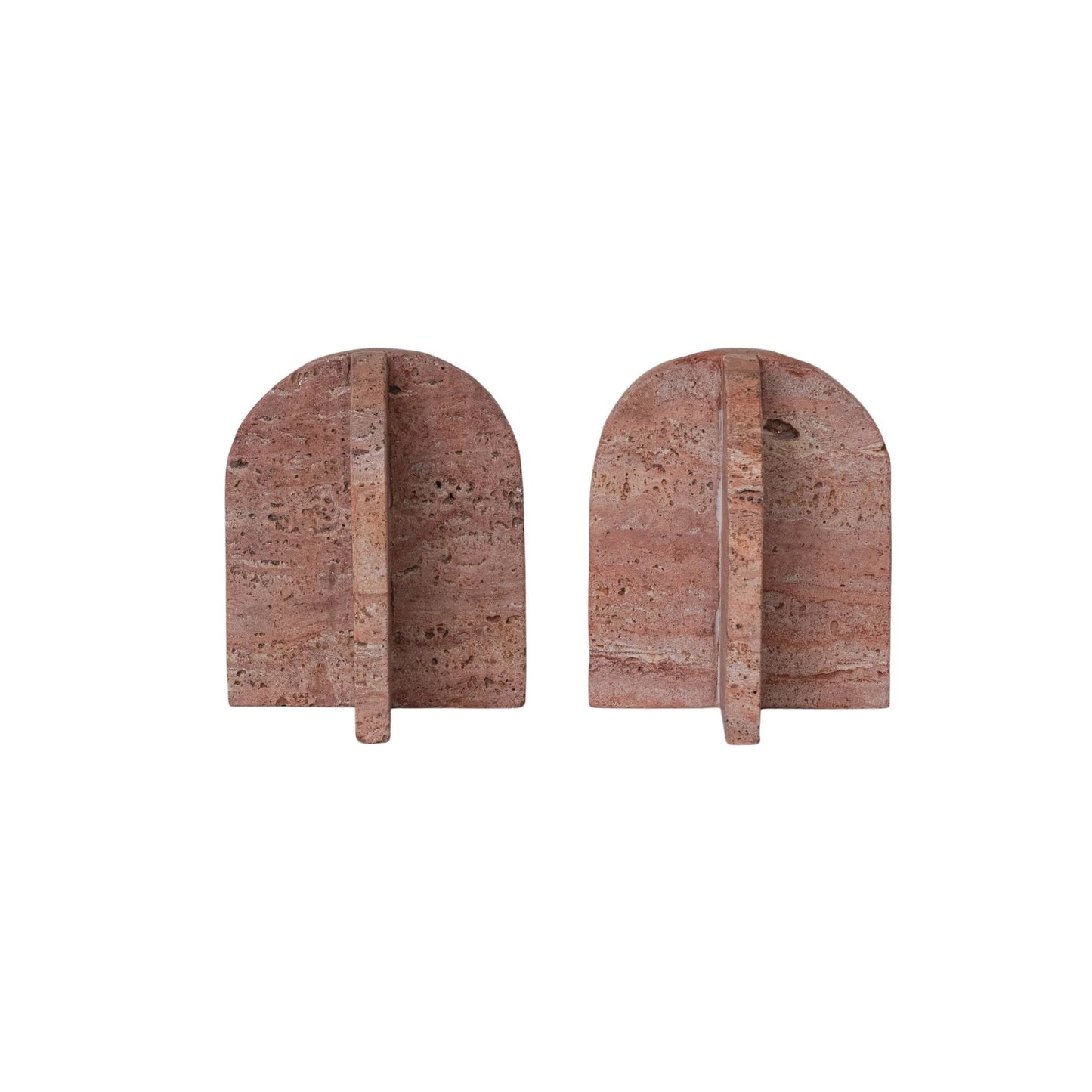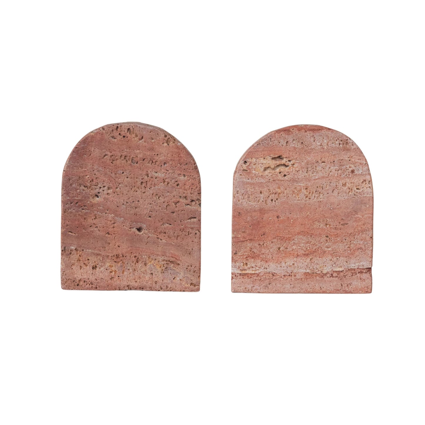 Add a touch of classical charm to any bookshelf with the Crimson Archways Travertine Bookends. Crafted from the earth's own artistry, these bookends feature bold red travertine, shaped into elegant arches that evoke the grandeur of ancient architecture. Each piece measures 5 inches long, 3 inches wide, and 6 inches high, offering a sturdy and stylish support for any literary work. The rich red hues of the travertine will add a pop of color to the collection, while the timeless design ensures these bookends will be a lasting addition to any home decor. Whether gracing a home office or adding a splash of color to a living space, these bookends merge form and function to create an enduring statement piece.