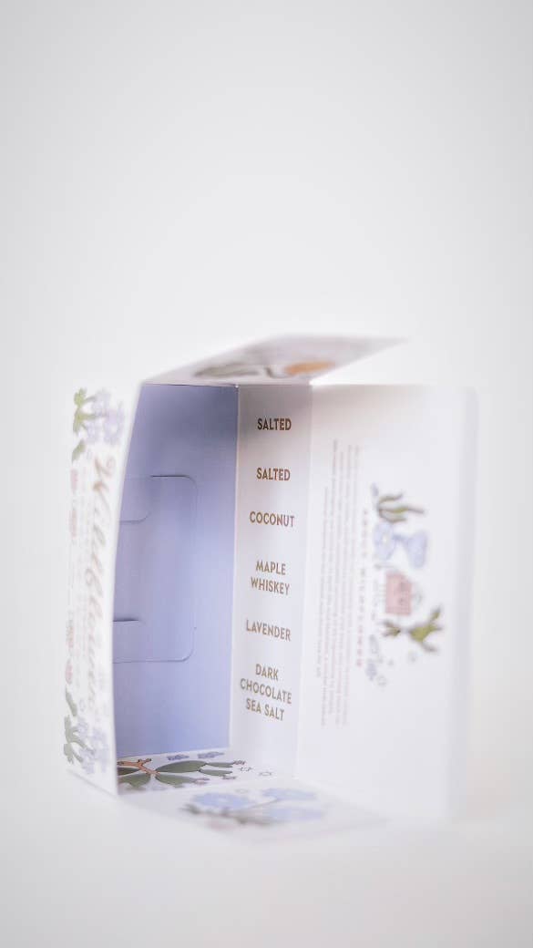 The box contains 2 pieces salted, and 1 each of honey lavender, maple whiskey, dark chocolate & sea salt and coconut.