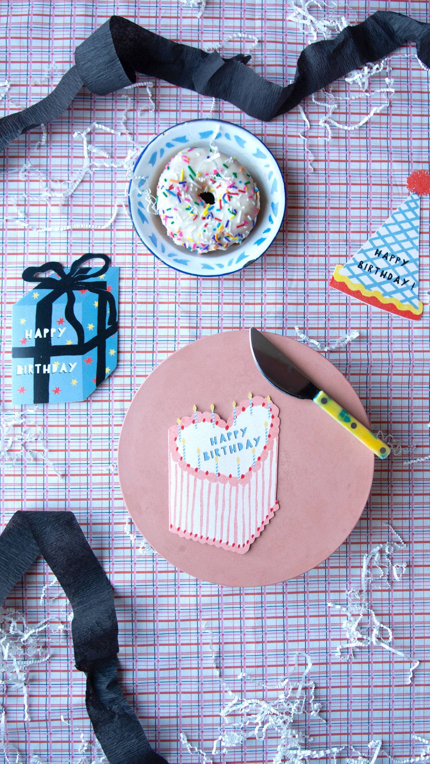 A beautiful blue gift with black ribbon, to wish the most wonderful Happy Birthday! A6 - 6.25x4.5" die cut folded card, printed in the USA on sustainably produced 18pt coated card stock. Each folded card is blank inside, comes with a brown kraft recycled envelope and is wrapped in a cello bag.