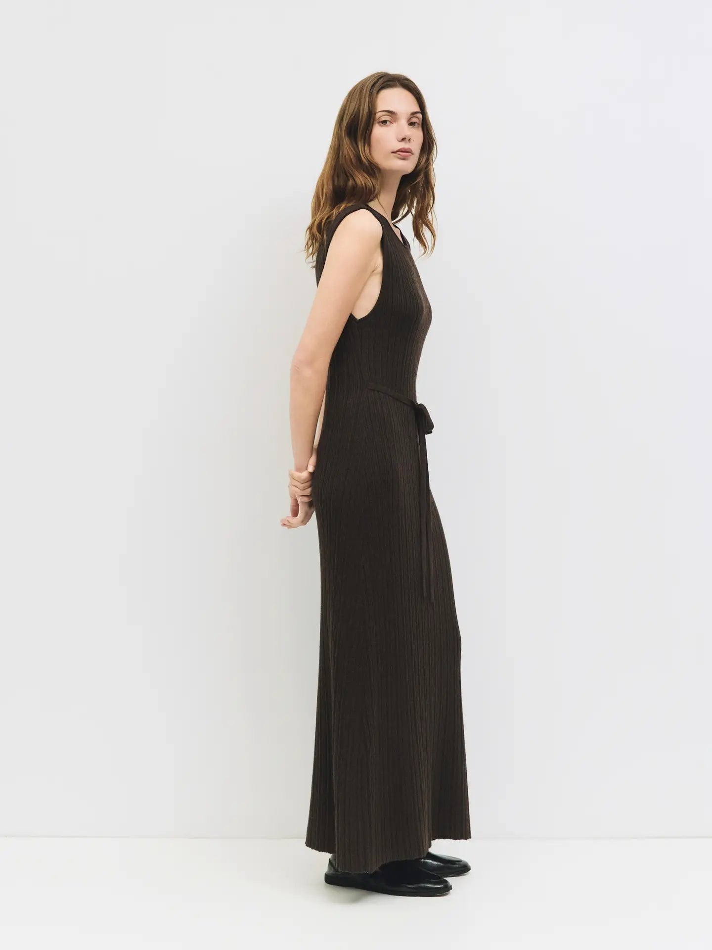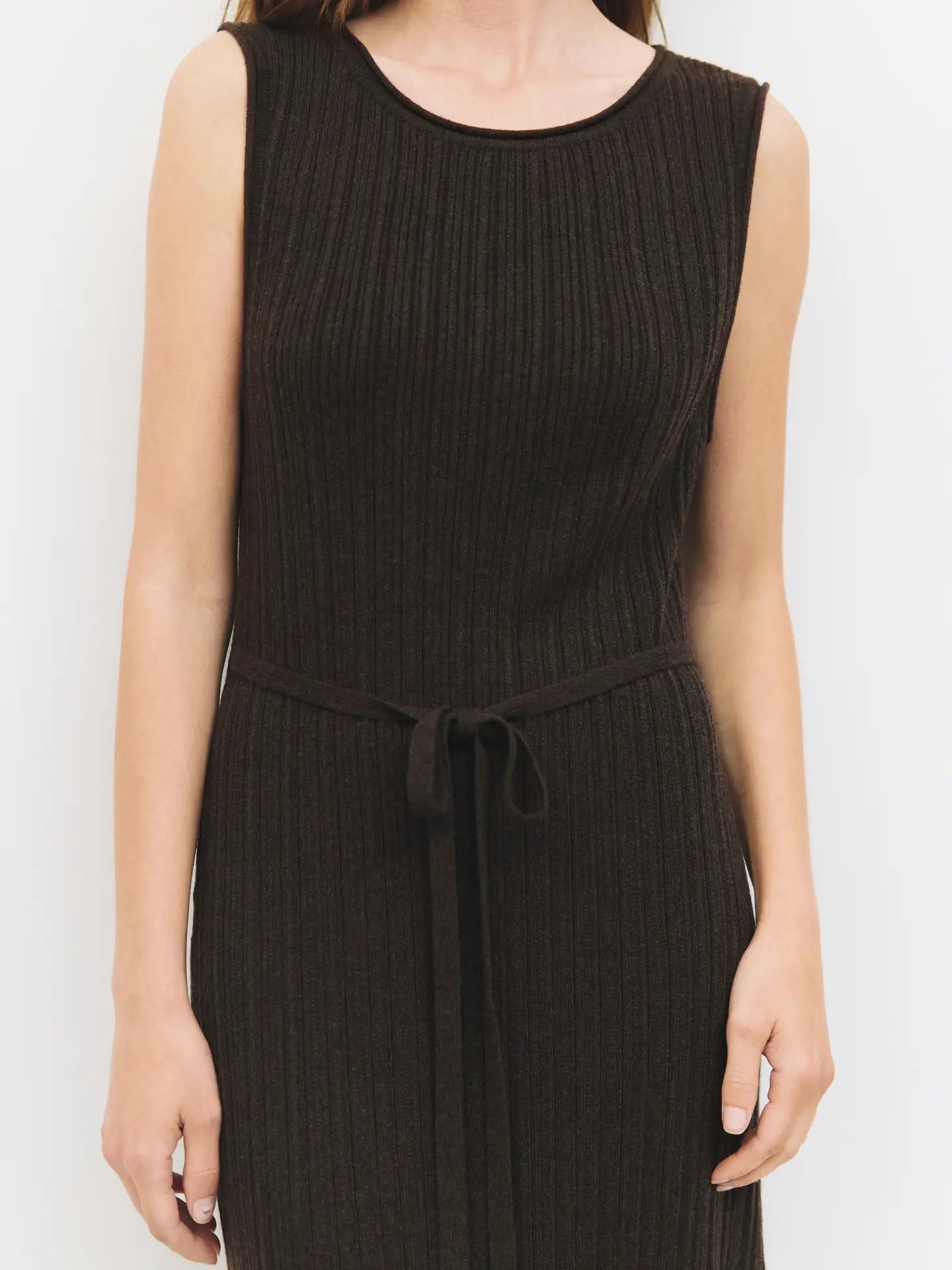 The Quinn Dress is a form-fitting, sleeveless midi style made from ribbed knit fabric with a crew neckline. Side ties add a subtle detail and allow for adjustable shaping at the waist.