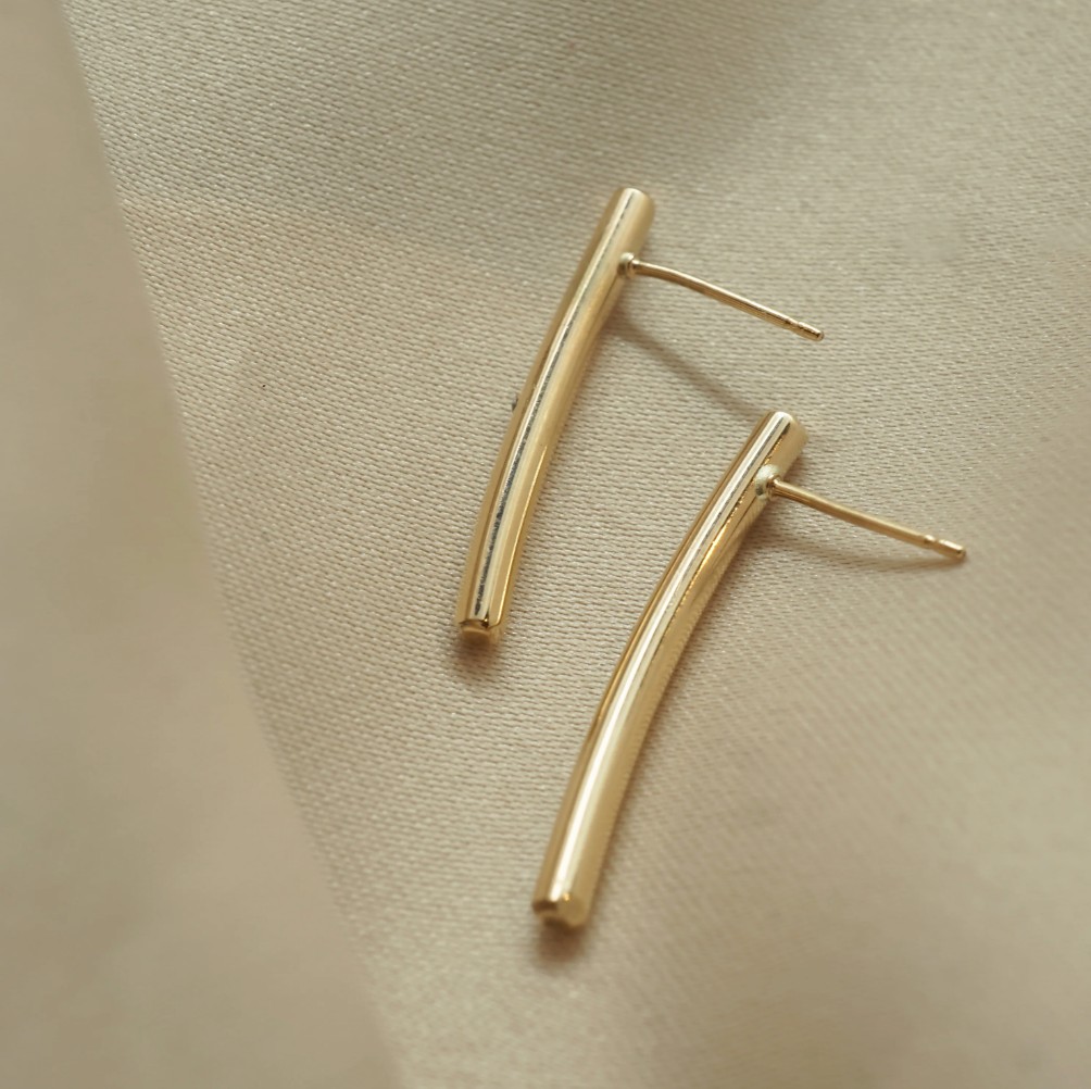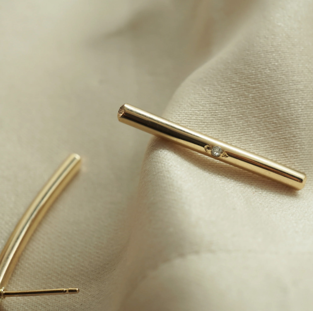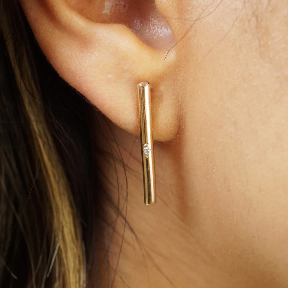 Regular price $75.00A weighty gold filled 1" bar drop earrings, each set with a 1.3mm brilliant cut diamond. The perfect subtle statement earring to wear with a loose chignon.