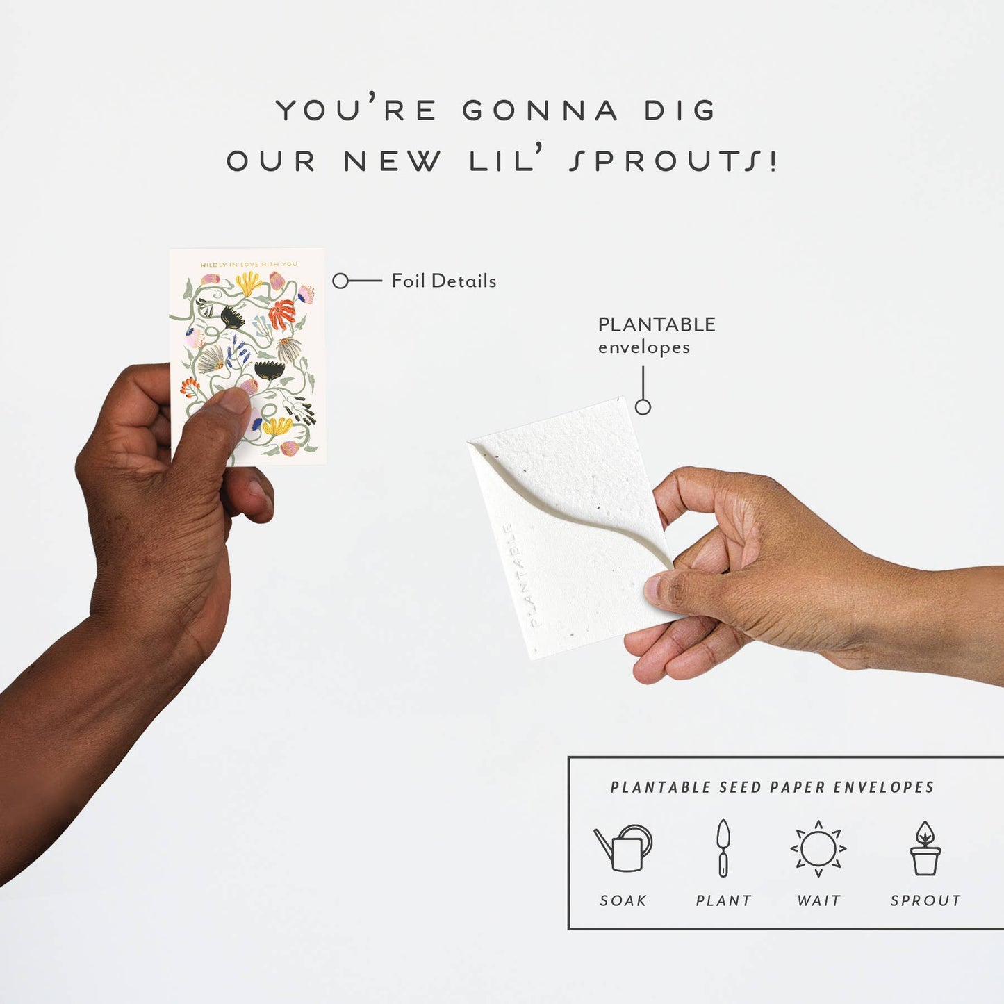 Meet the newest little SPROUT! Think all the goodness of our full size greeting card BUT at a petite "mini me" and super cute enclosure card size. All Seedlings sprouts have foil details and a PLANTABLE seed paper envelope which is embedded with wildflower seeds. This seed paper is made of a biodegradable eco-paper created with post-consumer materials - no trees harmed for this paper! When planted, our envelopes compost away leaving only flowers behind. Blank inside, our mini greeting cards are printed on premium paper and are all accented with foil details.