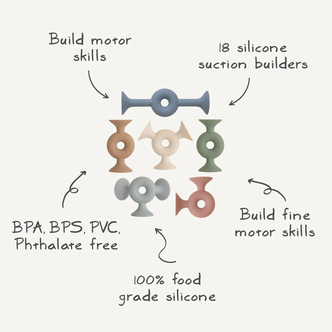 Unleash creativity and fun with this set of 18 silicone suction builder toys. Made from flexible, non-toxic silicone, the pieces easily connect, stack, and stick to smooth surfaces for a versatile toy during play time or bath time. Ideal for fostering motor skills and spatial awareness with endless opportunities to explore and create. When playtime is over, they neatly store away in a reusable storage container that keeps everything organized and ready for the next creation.