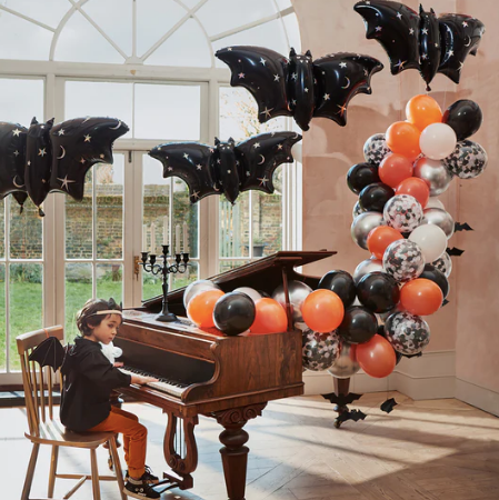 Regular price $27.00If you love party balloons, then this is the Halloween party decoration for you! This easy to assemble kit creates a terrific balloon display featuring black, silver, orange and pre-filled confetti balloons and fabulous hanging bats.