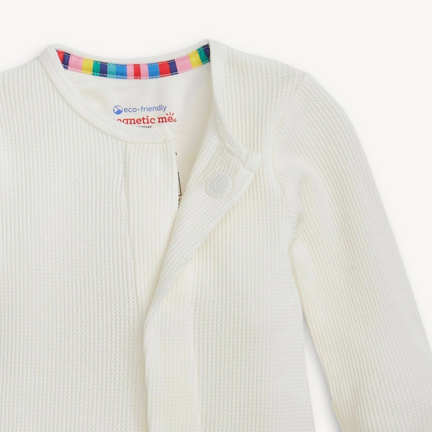Our waffle modal Magnetic Footie, also known as a sleeper, is made with magnetic closures that are quick, quiet, and a lifesaver for middle-of-the-night changes. A delicate fabric, eco-friendly waffle modal is a modal-organic cotton blend with ample stretch + rich texture.