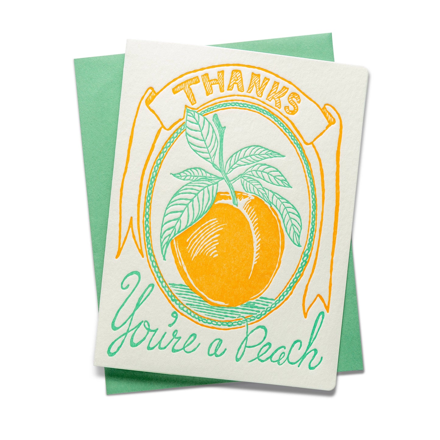 Share your thanks with our letterpress greeting card featuring a charming peach illustration. Let someone know they're as sweet and wonderful as a peach with a token of appreciation that's as delightful and heartfelt as your sentiments. "Thanks You're a Peach"